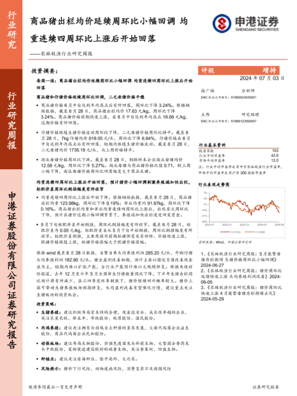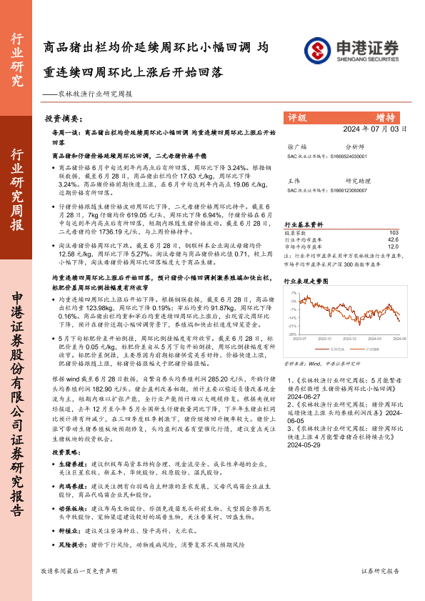 【申港证券】【20240703】20240703-申港证券-农林牧渔行业研究周报:商品猪出栏均价延续周环比小幅回调 均重连续四周环比上涨后开始回落-13页