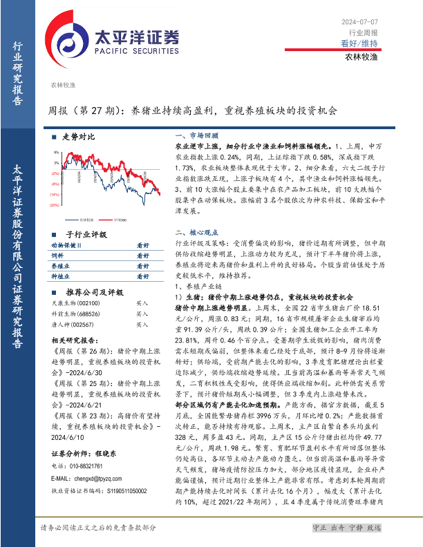 【太平洋证券】【20240707】20240707-太平洋-农林牧渔周报(第27期):养猪业持续高盈利,重视养殖板块的投资机会-17页