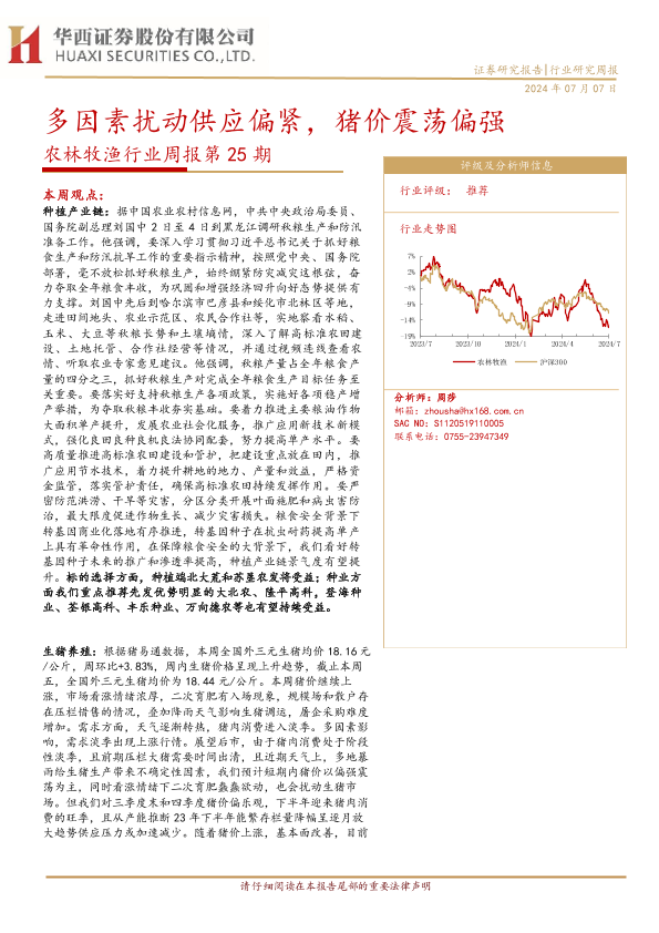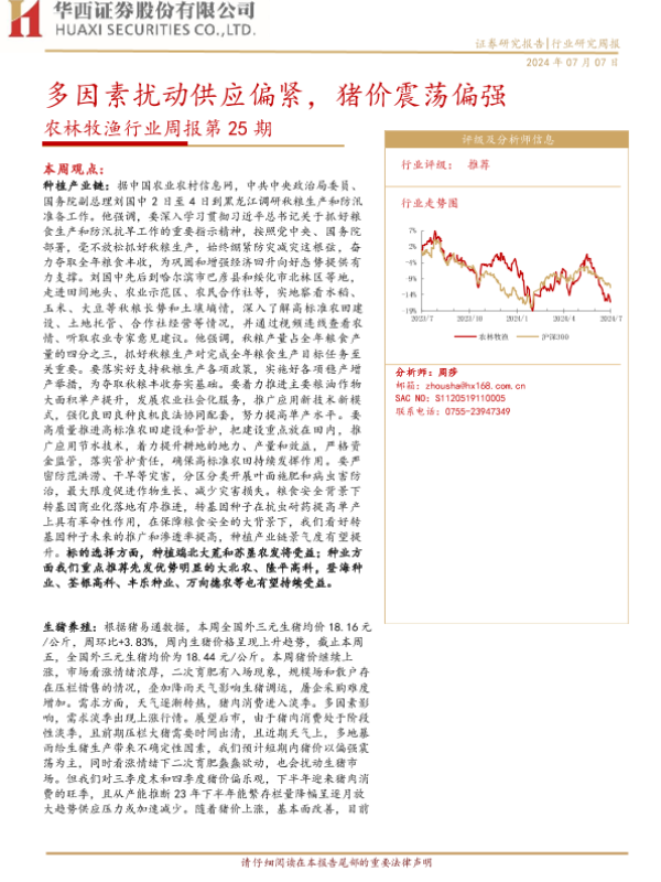 【华西证券】【20240707】20240707-华西证券-农林牧渔行业周报第25期:多因素扰动供应偏紧,猪价震荡偏强-25页