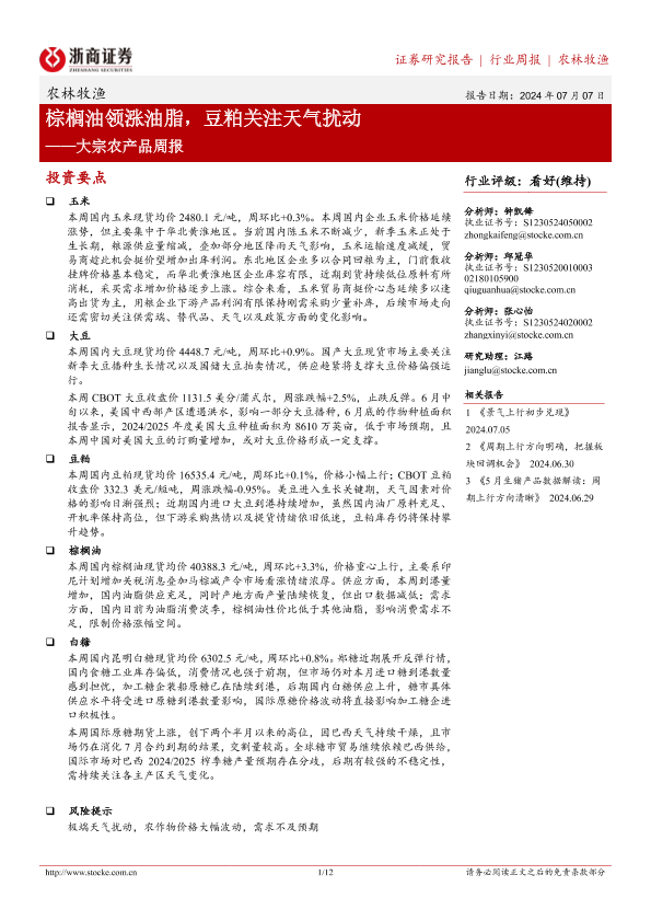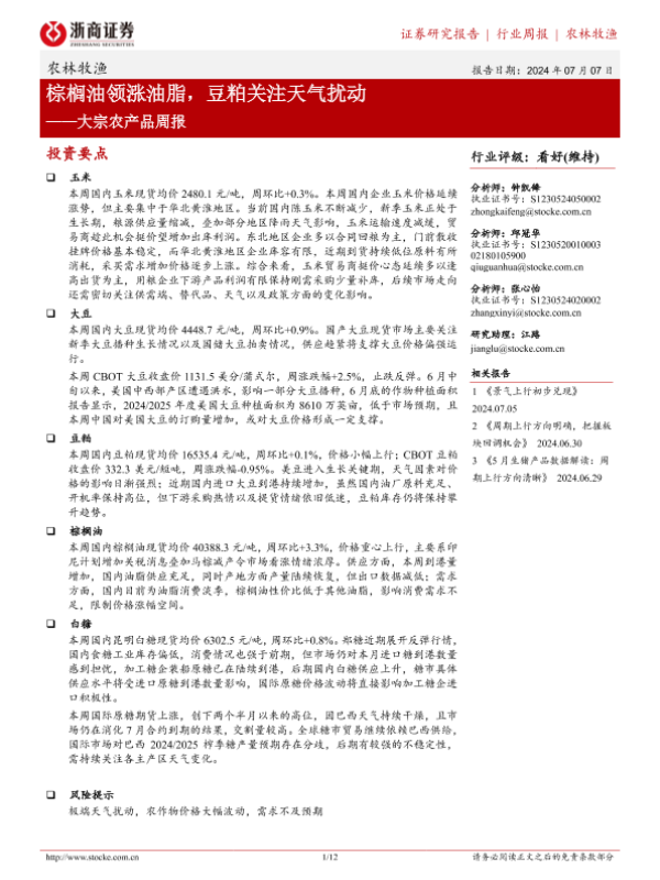 【浙商证券】【20240707】20240707-浙商证券-大宗农产品周报:棕榈油领涨油脂,豆粕关注天气扰动-12页