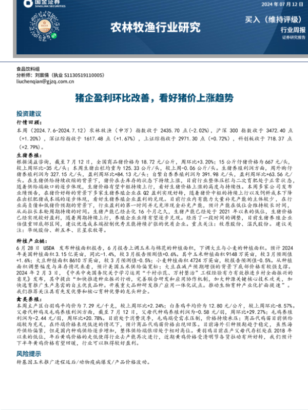 【国金证券】【20240712】20240712-国金证券-农林牧渔行业周报:猪企盈利环比改善,看好猪价上涨趋势-13页