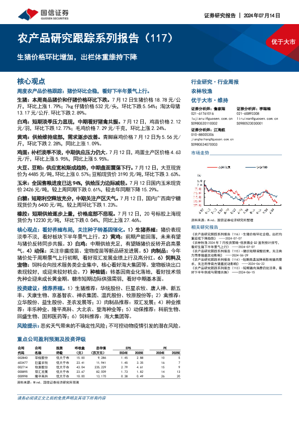 【国信证券】【20240714】20240714-国信证券-农产品研究跟踪系列报告(117):生猪价格环比增加,出栏体重维持下降-26页