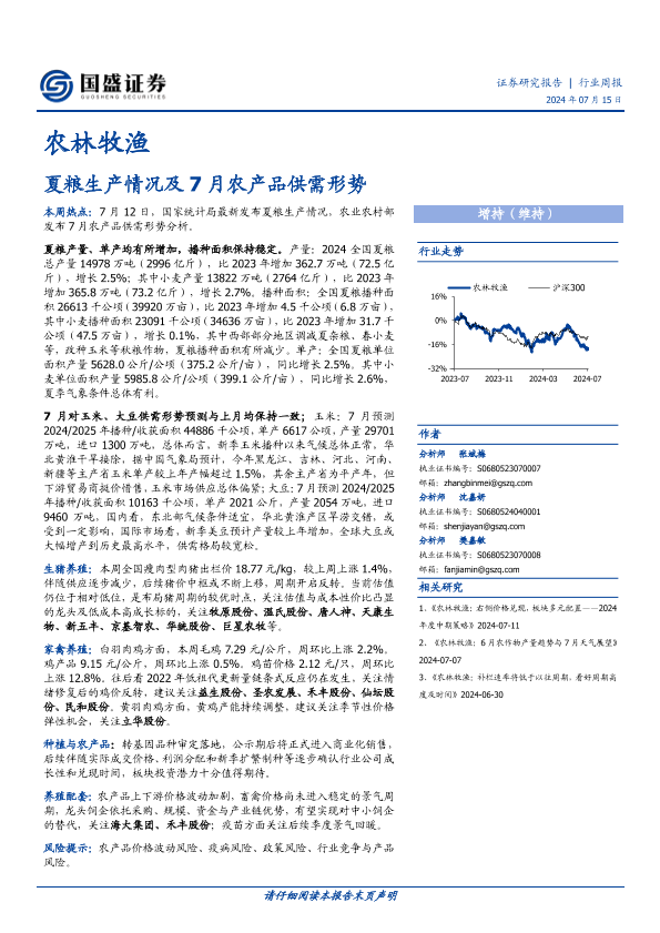 【国盛证券】【20240715】20240715-国盛证券-农林牧渔行业周报:夏粮生产情况及7月农产品供需形势-13页