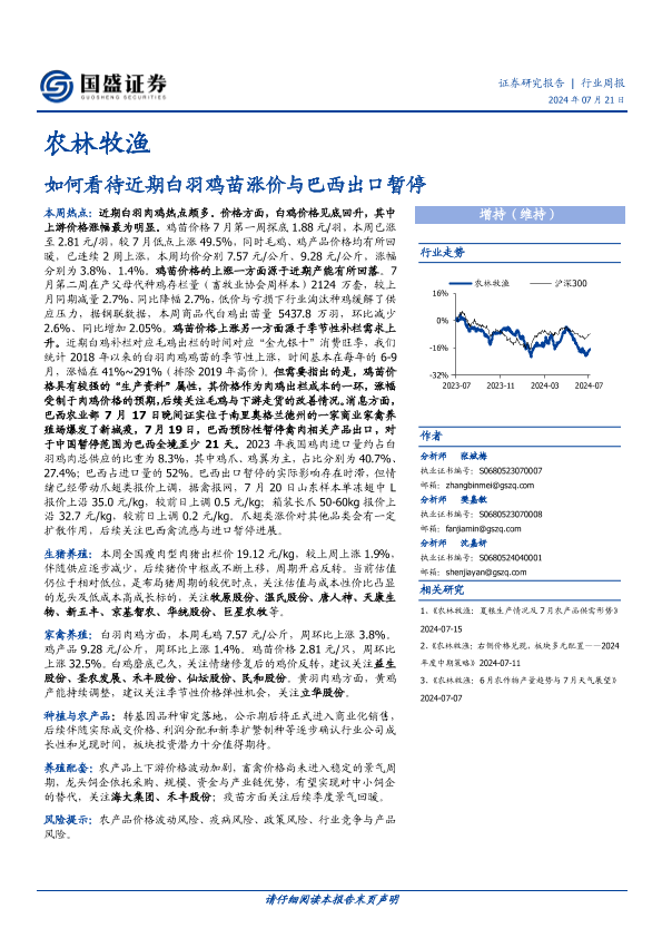 【国盛证券】【20240721】20240721-国盛证券-农林牧渔行业周报:如何看待近期白羽鸡苗涨价与巴西出口暂停-15页