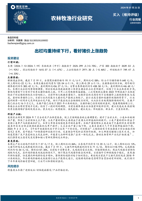 【国金证券】【20240721】20240721-国金证券-农林牧渔行业研究:出栏均重持续下行,看好猪价上涨趋势-14页