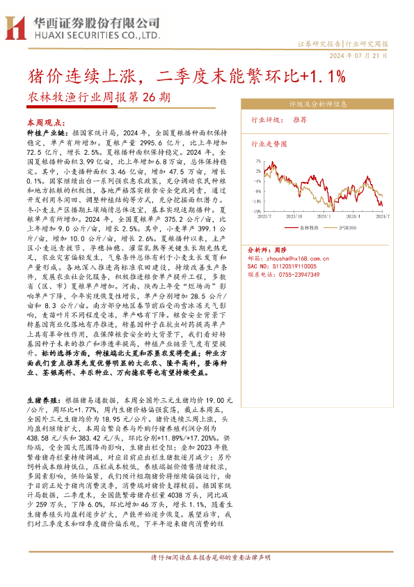 【华西证券】【20240721】20240721-华西证券-农林牧渔行业周报第26期:猪价连续上涨,二季度末能繁环比+1.1%-25页