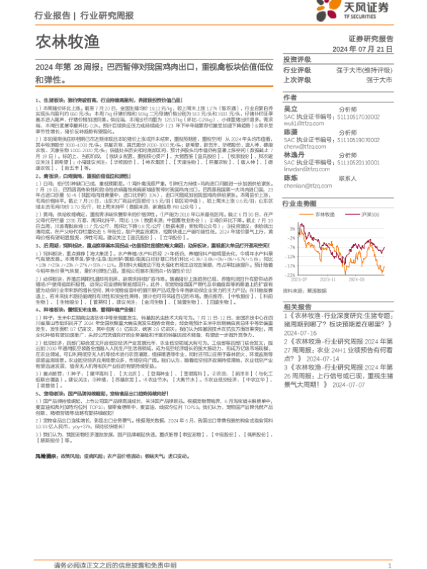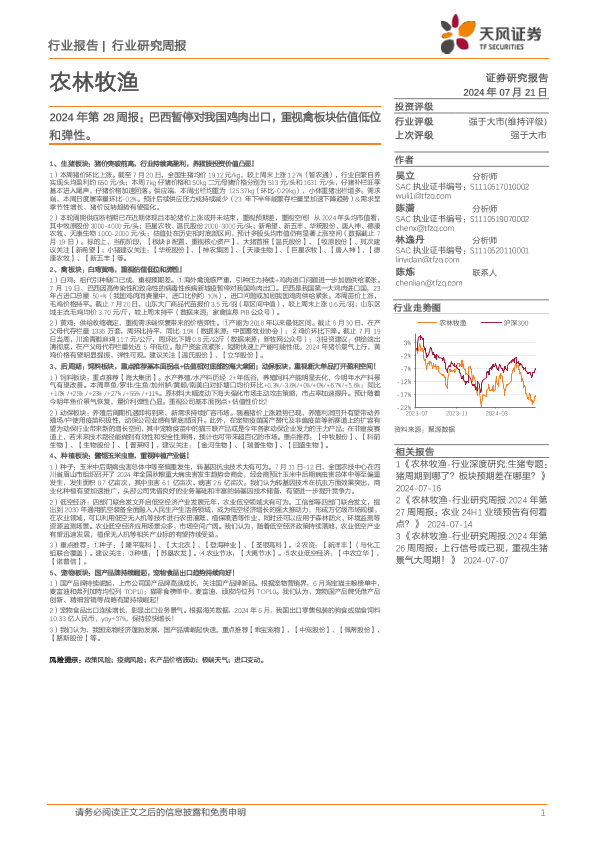 【天风证券】【20240721】2024年第28周报:巴西暂停对我国鸡肉出口,重视禽板块估值低位和弹性-14页
