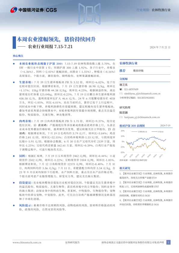 【银河证券】【20240721】20240721-中国银河-农业行业周报:本周农业涨幅领先,猪价持续回升-15页