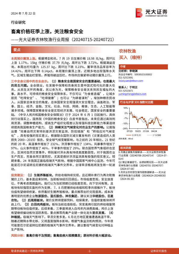 【光大证券】【20240722】20240722-光大证券-农林牧渔行业周报:畜禽价格旺季上涨,关注粮食安全-15页