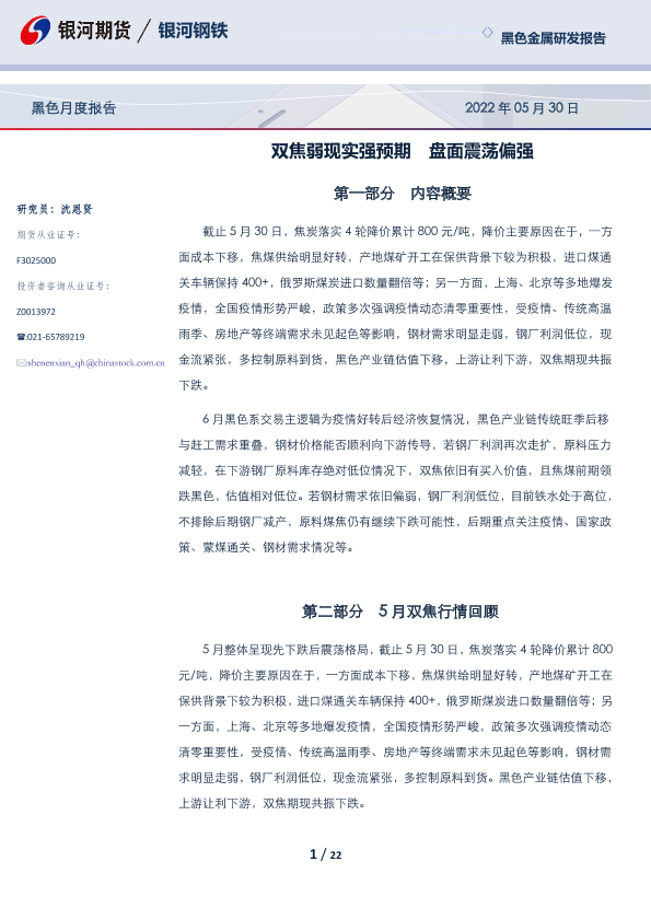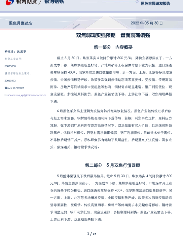【银河期货】【20220530】黑色月度报告:双焦弱现实强预期,盘面震荡偏强-22页