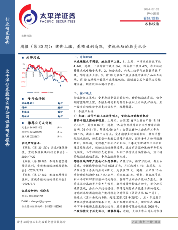 【太平洋证券】【20240728】20240728-太平洋-农林牧渔周报(第30期):猪价上涨,养殖盈利高涨,重视板块的投资机会-17页