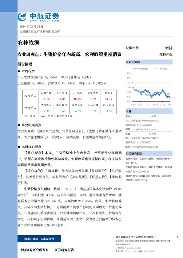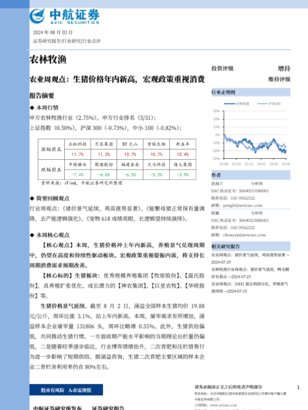 【中航证券】【20240803】农业周观点:生猪价格年内新高,宏观政策重视消费-13页
