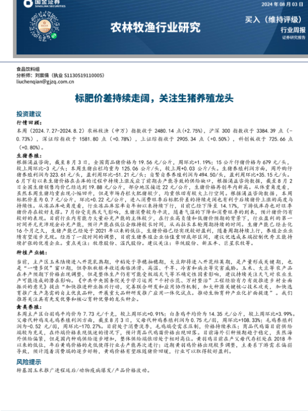 【国金证券】【20240803】20240803-国金证券-农林牧渔行业周报:标肥价差持续走阔,关注生猪养殖龙头-14页