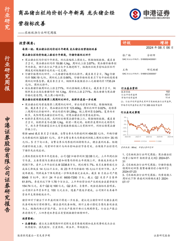 【申港证券】【20240806】20240806-申港证券-农林牧渔行业研究周报:商品猪出栏均价创今年新高,龙头猪企经营指标改善-14页