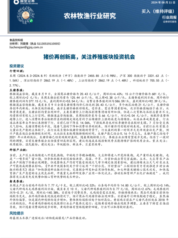【国金证券】【20240811】20240811-国金证券-农林牧渔行业研究周报:猪价再创新高,关注养殖板块投资机会-14页
