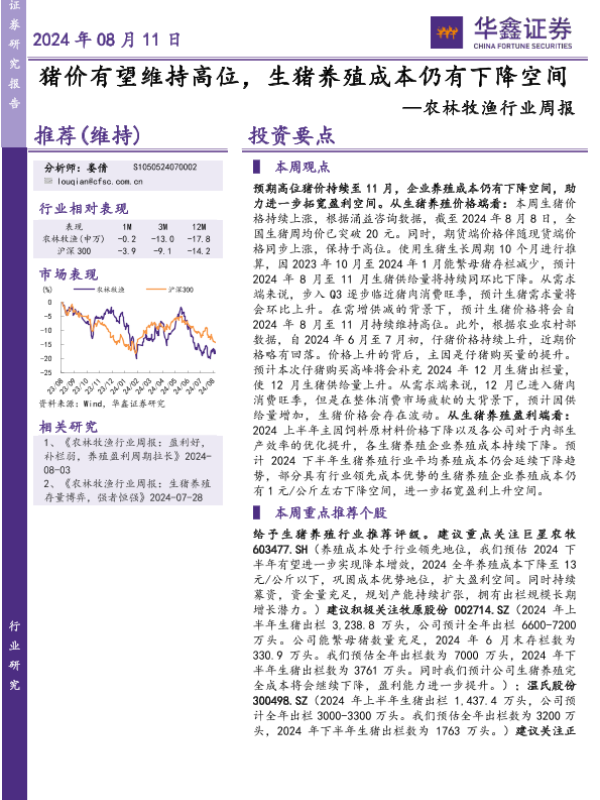 【华鑫证券】【20240811】20240811-华鑫证券-农林牧渔行业周报:猪价有望维持高位,生猪养殖成本仍有下降空间-16页