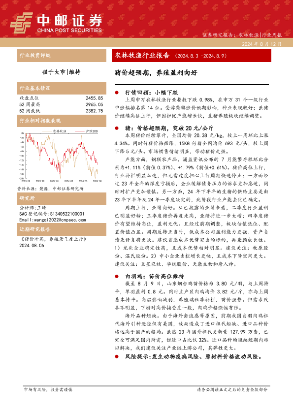 【中邮证券】【20240812】20240812-中邮证券-农林牧渔行业报告:猪价超预期,养殖盈利向好-12页