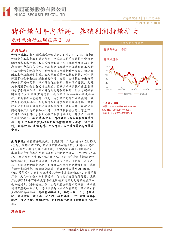 【华西证券】【20240818】20240818-华西证券-农林牧渔行业周报第31期:猪肉猪价续创年内新高,养殖利润持续扩大-25页