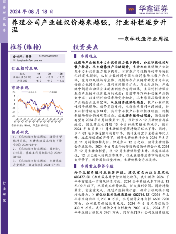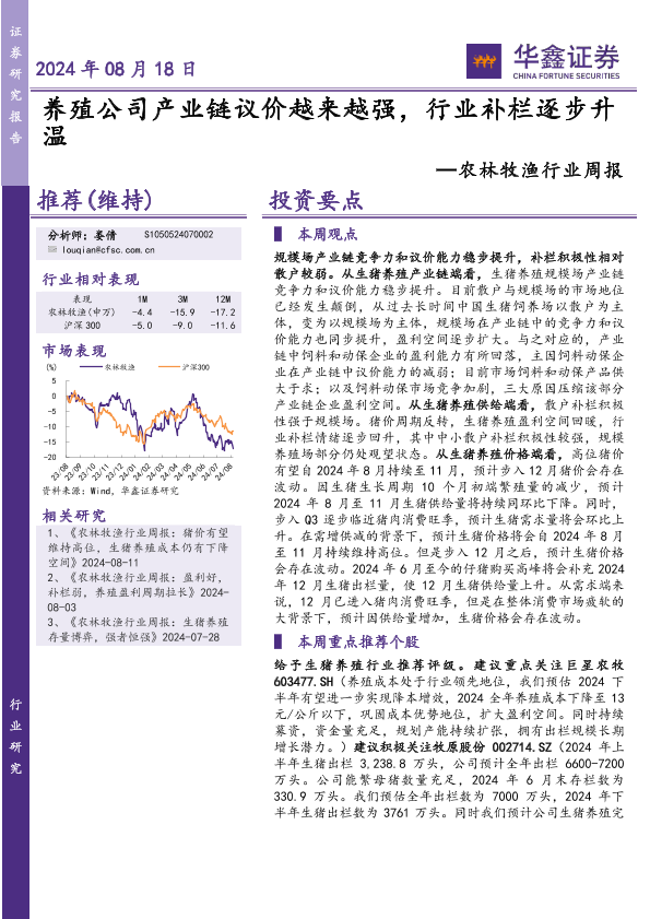 【华鑫证券】【20240818】20240818-华鑫证券-农林牧渔行业周报:养殖公司产业链议价越来越强,行业补栏逐步升温-16页