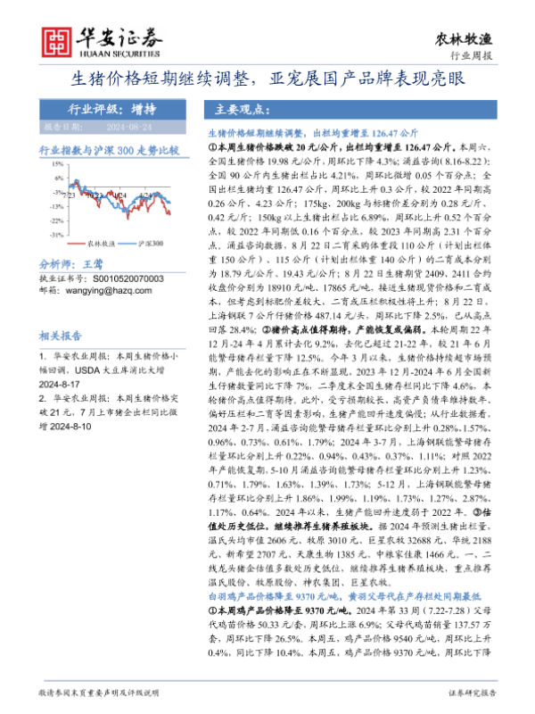 【华安证券】【20240824】20240824-华安证券-农林牧渔行业周报:生猪价格短期继续调整,亚宠展国产品牌表现亮眼-45页