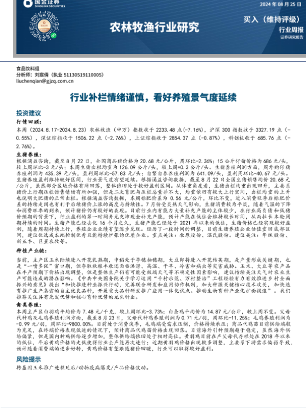 【国金证券】【20240825】20240825-国金证券-农林牧渔行业周报:行业补栏情绪谨慎,看好养殖景气度延续-14页