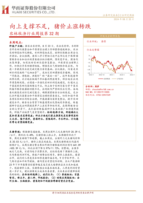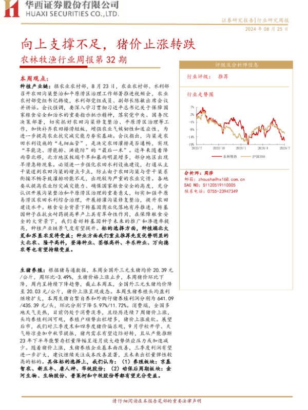 【华西证券】【20240825】20240825-华西证券-农林牧渔行业周报第32期:向上支撑不足,猪价止涨转跌-25页