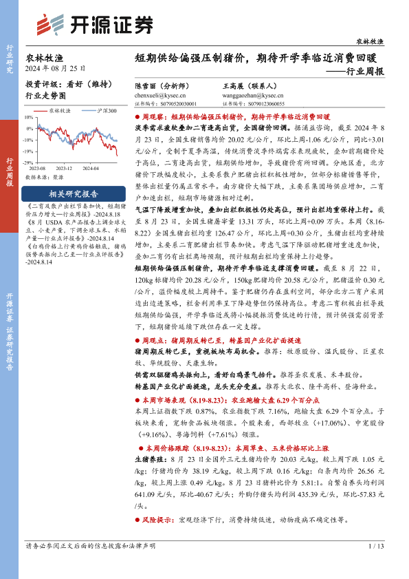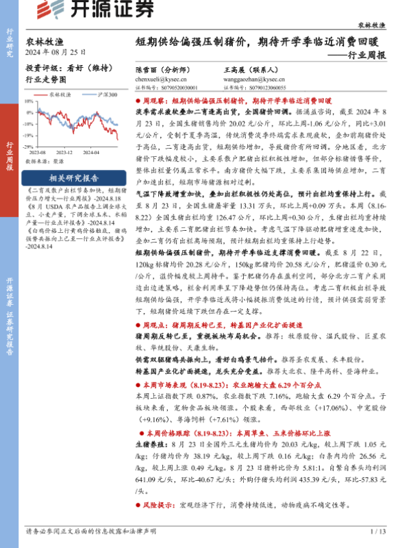 【开源证券】【20240825】农林牧渔行业周报:短期供给偏强压制猪价,期待开学季临近消费回暖-13页