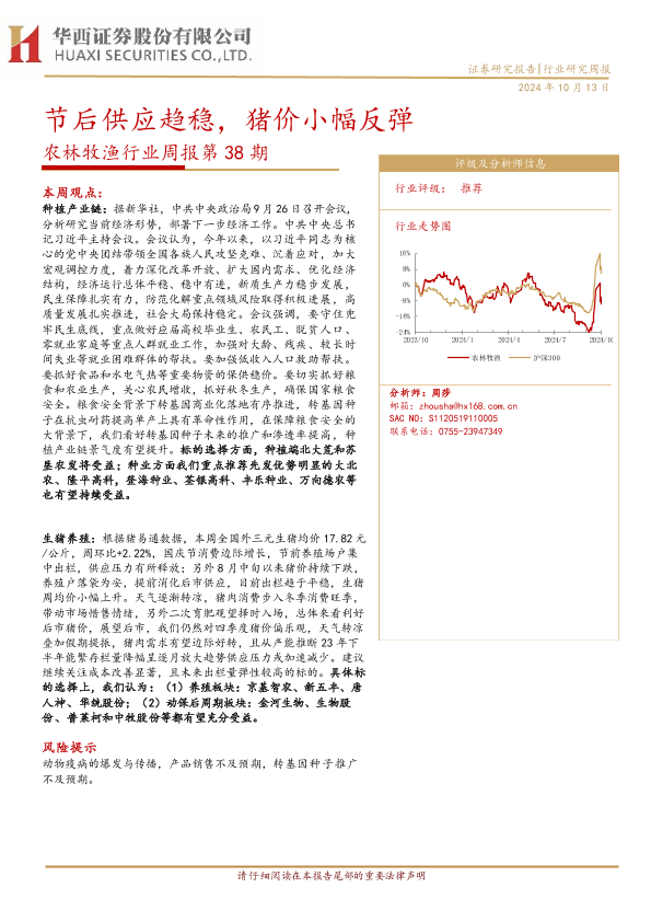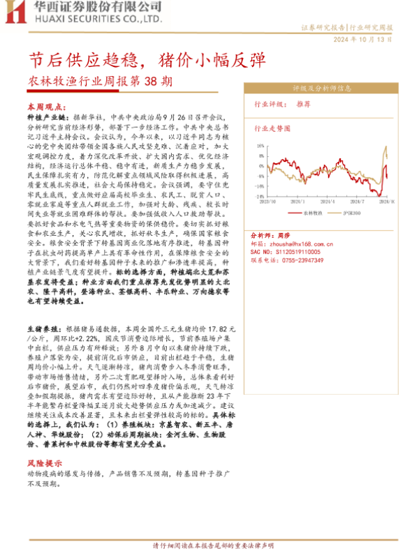 【华西证券】【20241013】20241013-华西证券-农林牧渔行业周报第38期:节后供应趋稳,猪价小幅反弹-25页