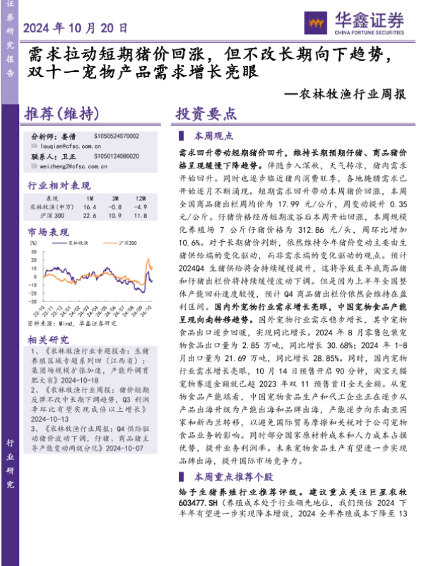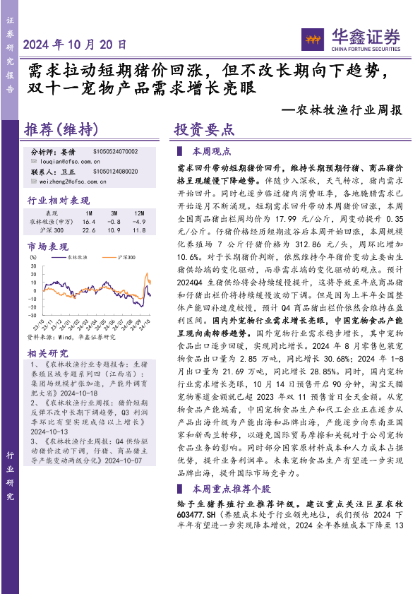 【华鑫证券】【20241020】20241020-华鑫证券-农林牧渔行业周报:需求拉动短期猪价回涨,但不改长期向下趋势,双十一宠物产品需求增长亮眼-16页