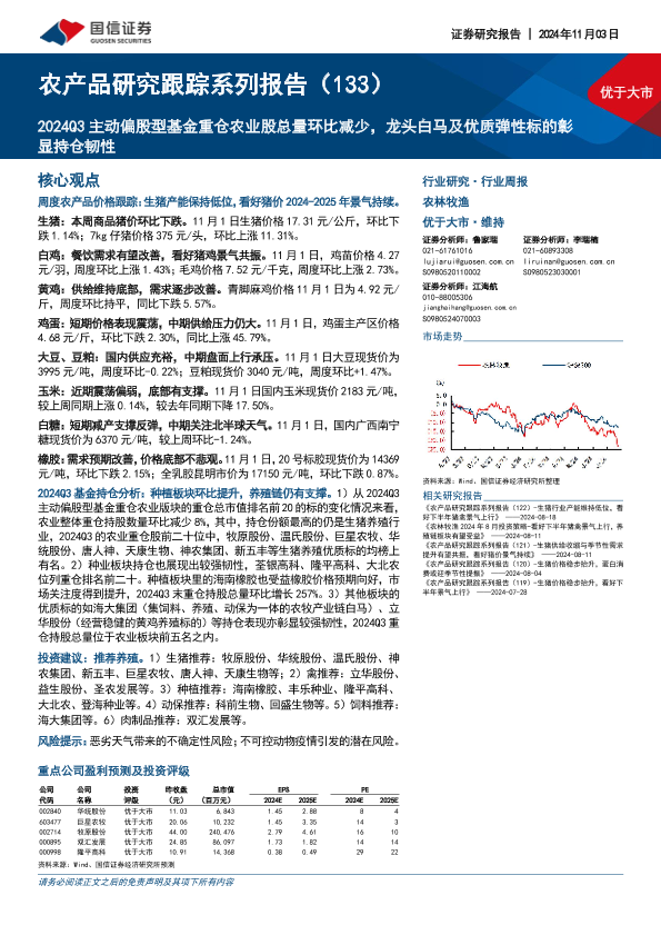 【国信证券】【20241103】2024Q3主动偏股型基金重仓农业股总量环比减少,龙头白马及优质弹性标的彰显持仓韧性-32页