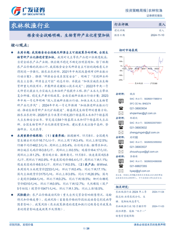 【广发证券】【20241110】20241110-广发证券-农林牧渔行业投资策略周报:粮食安全战略明确,生物育种产业化有望加快-26页