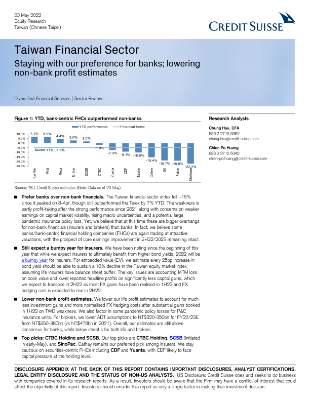 【Credit Suisse】【20220523】瑞信-中国台湾金融业-坚持我们对银行的偏好;降低非银行机构的利润预期-26页