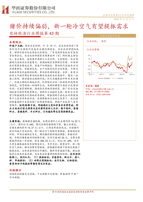【华西证券】【20241117】20241117-华西证券-农林牧渔行业周报第43期:猪价持续偏弱,新一轮冷空气有望提振需求-25页