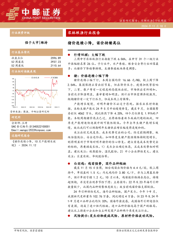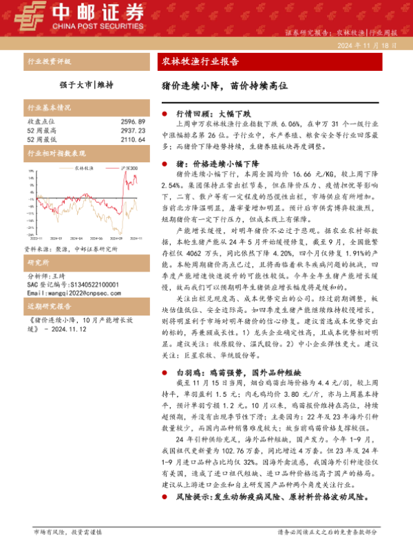 【中邮证券】【20241118】20241118-中邮证券-农林牧渔行业报告:猪价连续小降,苗价持续高位-12页