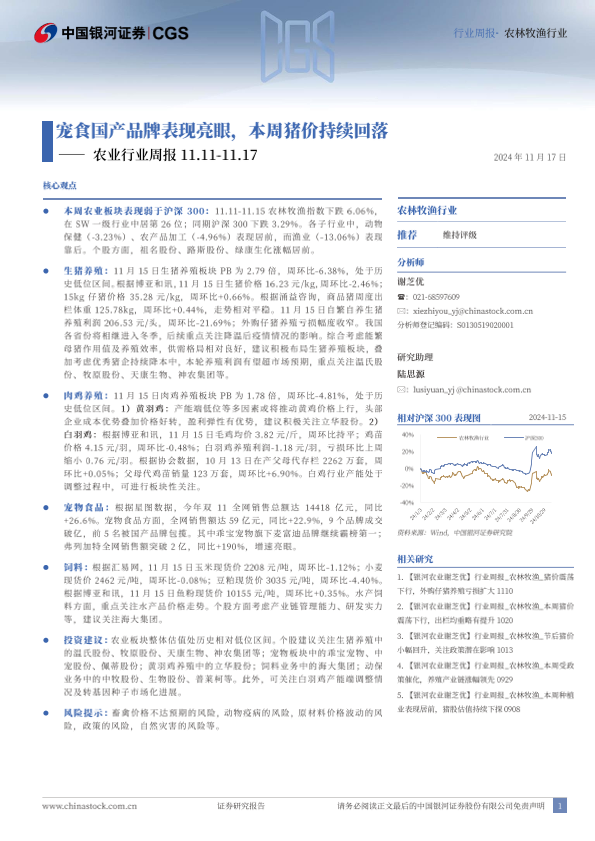 【银河证券】【20241117】20241117-中国银河-农业行业周报:宠食国产品牌表现亮眼,本周猪价持续回落-15页