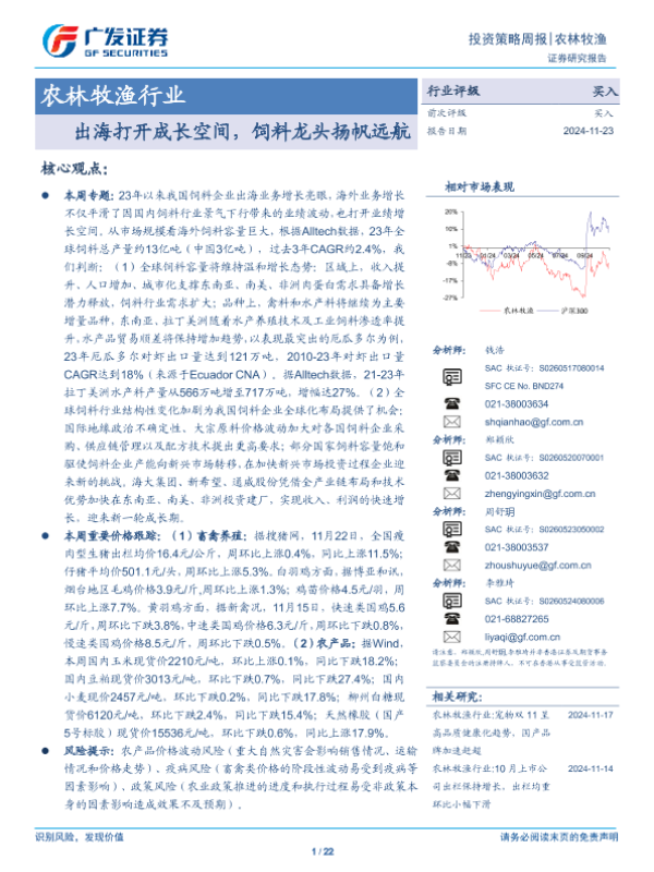 【广发证券】【20241123】20241123-广发证券-农林牧渔行业投资策略周报:出海打开成长空间,饲料龙头扬帆远航-22页