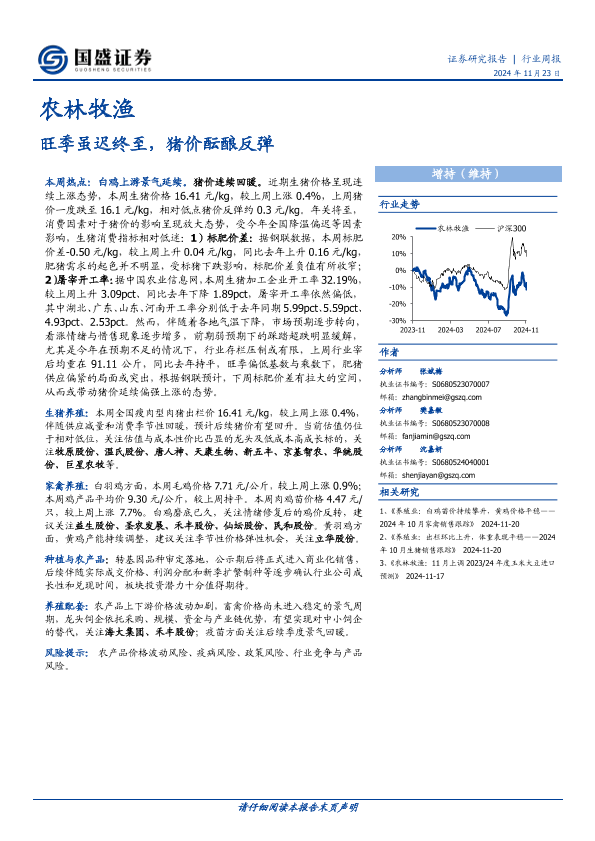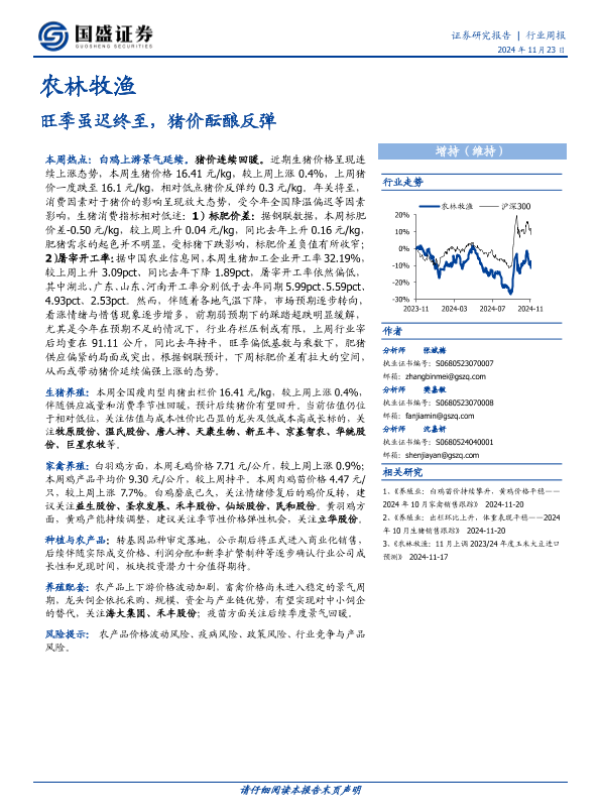 【国盛证券】【20241123】农林牧渔行业周报:旺季虽迟终至,猪价酝酿反弹-12页