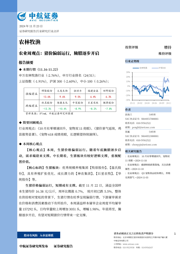 【中航证券】【20241123】农业周观点:猪价偏弱运行,腌腊逐步开启-14页