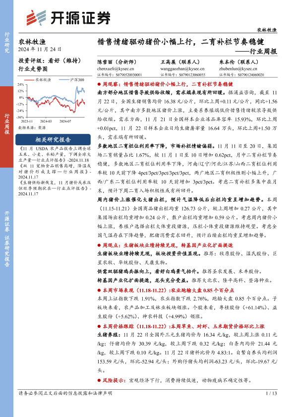 【开源证券】【20241124】农林牧渔行业周报:惜售情绪驱动猪价小幅上行,二育补栏节奏稳健-13页