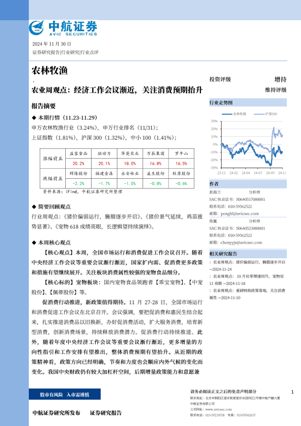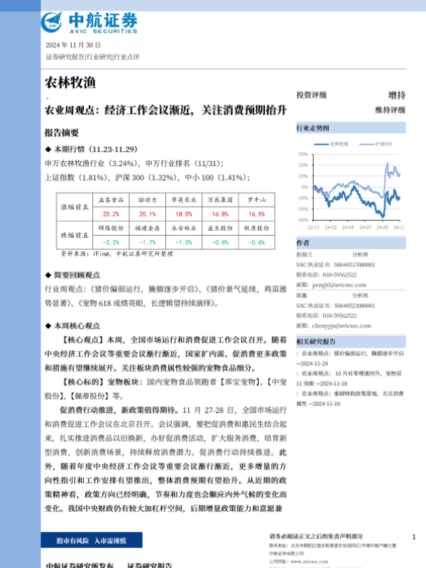 【中航证券】【20241130】农业周观点:经济工作会议渐近,关注消费预期抬升-13页
