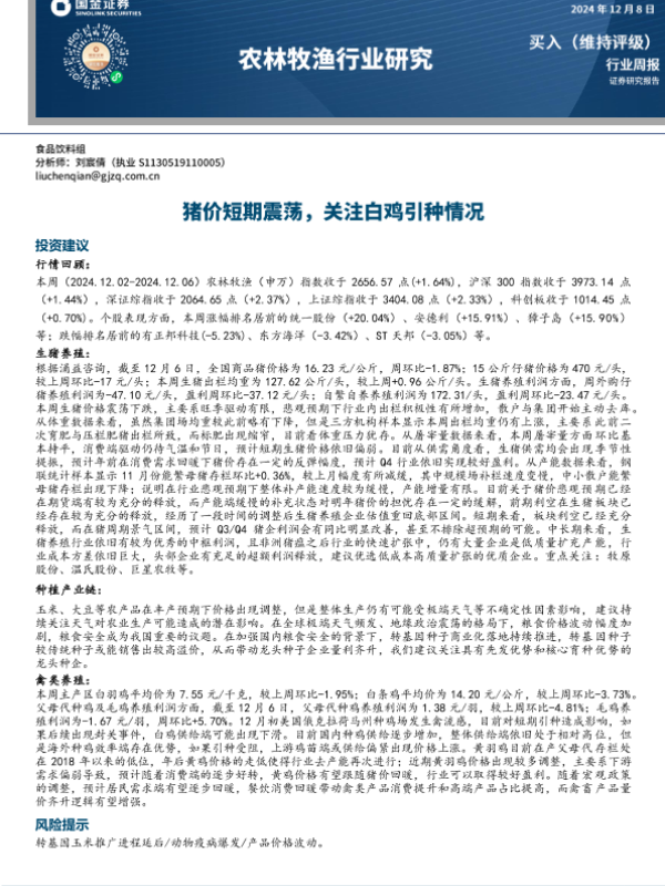 【国金证券】【20241208】20241208-国金证券-农林牧渔行业研究:猪价短期震荡,关注白鸡引种情况-13页