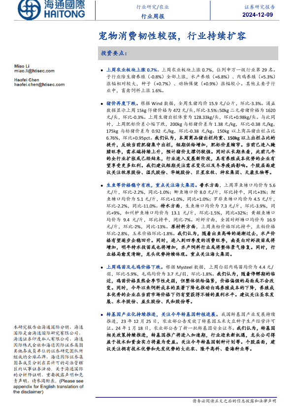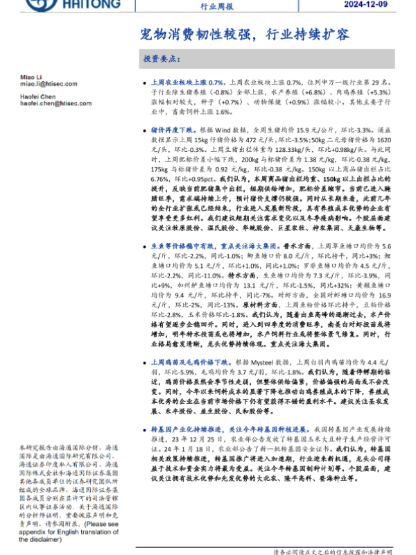 【海通国际】【20241209】20241209-海通国际-农业行业周报:宠物消费韧性较强,行业持续扩容-18页