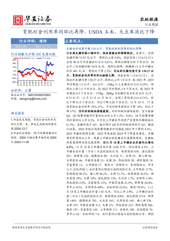【华安证券】【20241214】20241214-华安证券-农林牧渔行业周报:育肥栏舍利用率同环比再降,USDA玉米、大豆库消比下降-42页