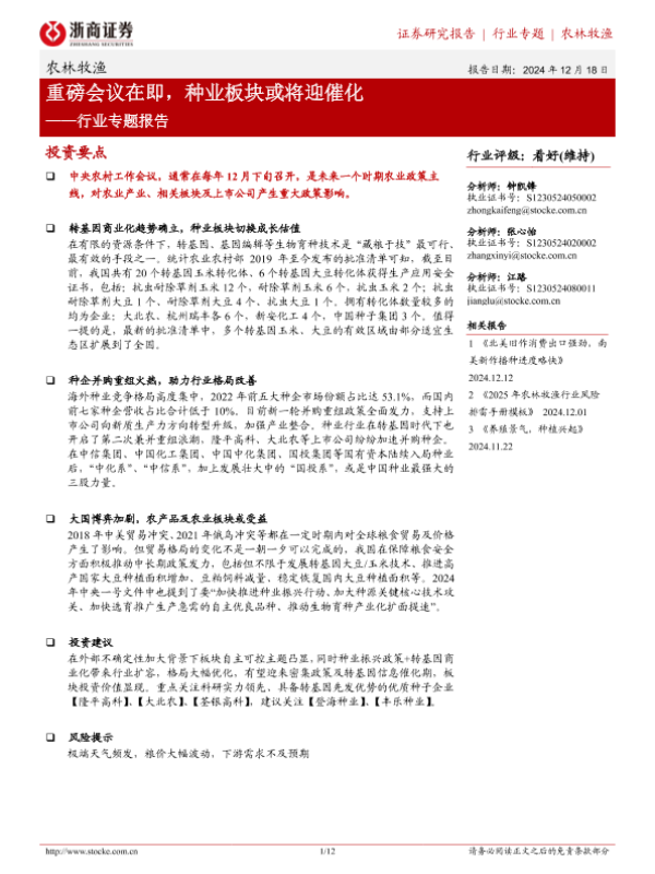 【浙商证券】【20241218】20241218-浙商证券-农林牧渔行业专题报告:重磅会议在即,种业板块或将迎催化-12页