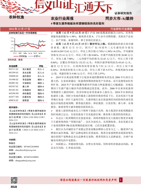 【山西证券】【20241217】农业行业周报:4季度生猪养殖板块有望继续保持良好盈利-19页