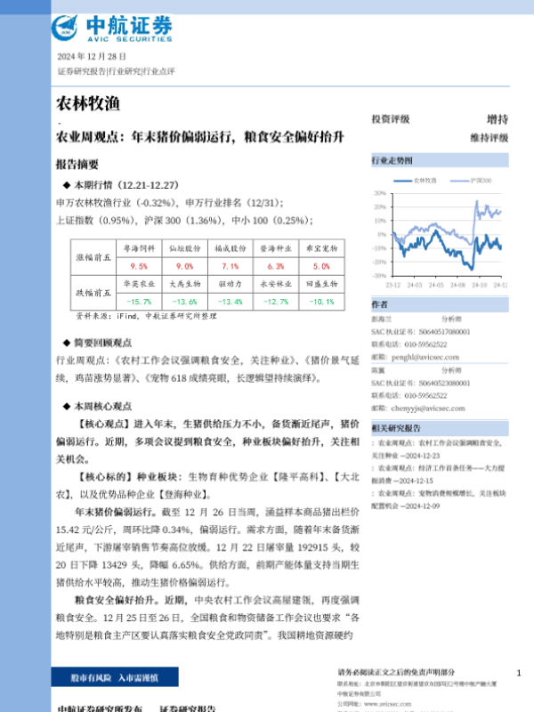 【中航证券】【20241228】农业周观点:年未猪价偏弱运行,粮食安全偏好拾升-13页