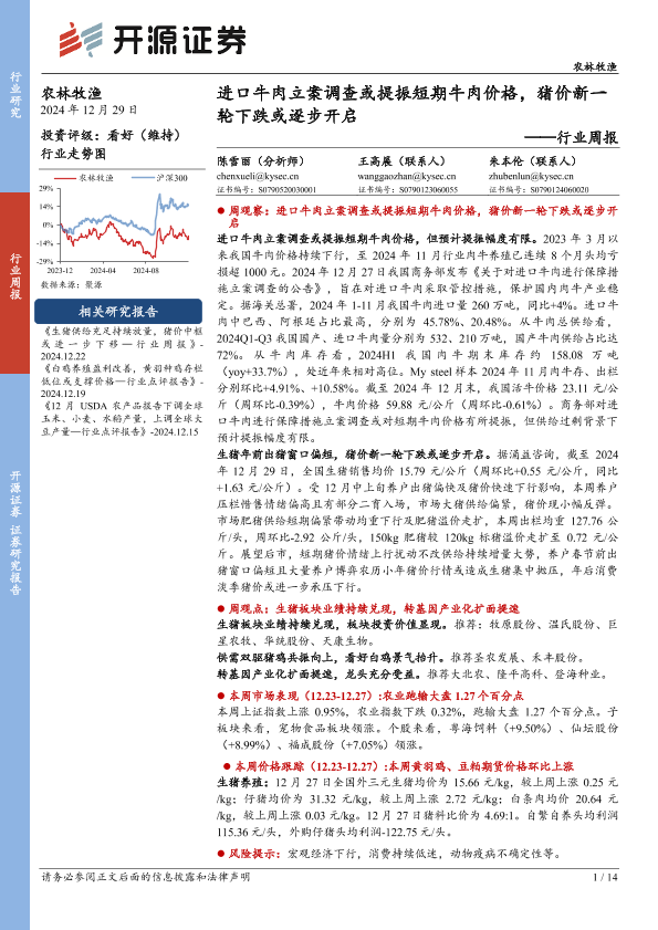 【开源证券】【20241229】农林牧渔行业周报:进口牛肉立案调查或提振短期牛肉价格,猪价新一轮下跌或逐步开启-14页