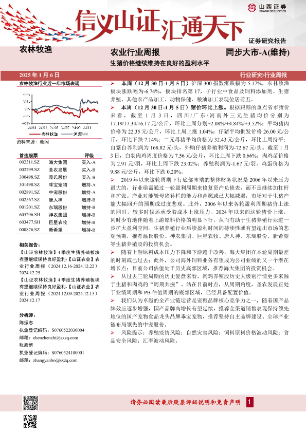 【山西证券】【20250106】农业行业周报:生猪价格继续维持在良好的盈利水平-19页