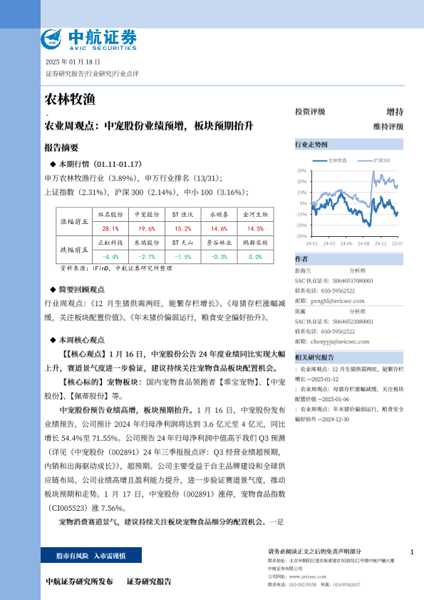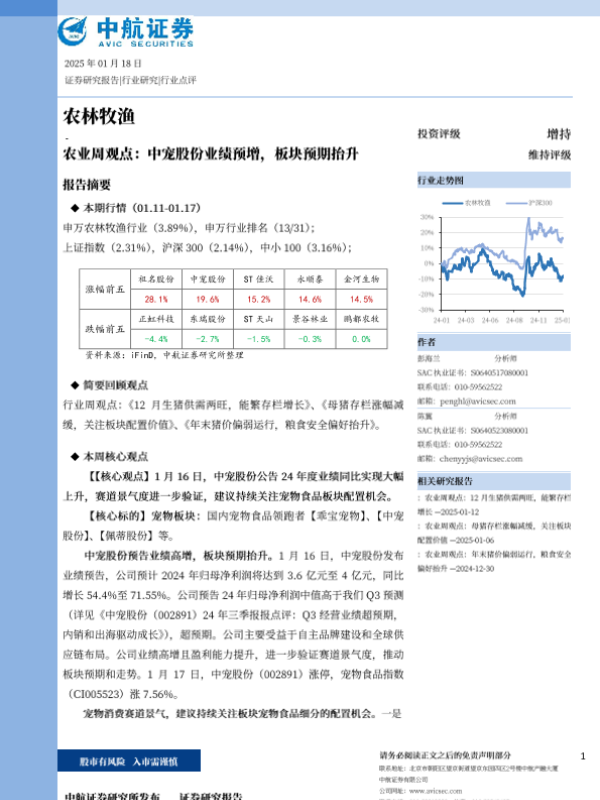 【中航证券】【20250118】农林牧渔行业周观点:中宠股份业绩预增,板块预期抬升-13页