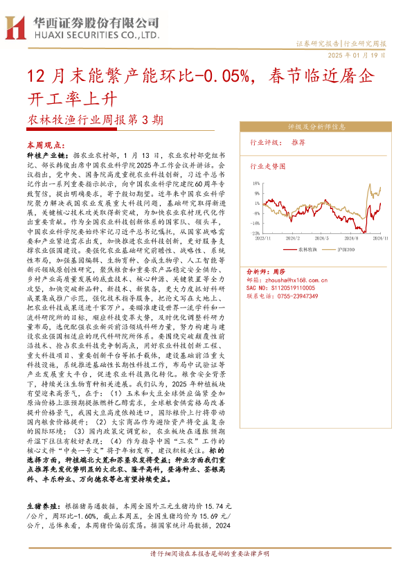 【华西证券】【20250119】农林牧渔行业周报第3期:12月末能繁产能环比-0.05%,春节临近屠企开工率上升-25页